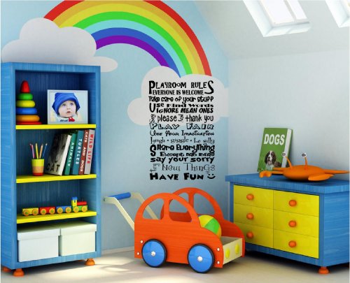 Playroom Rules everyone is welcome Take care of your stuff Use kind words Ignore mean ones say please and thank you Play fair Use your Imagination Laugh Giggle Be silly Share everything except bad ideas Say your sorry Try new Things Have Fun. cute wall art wall sayings decal this product is a lot people search and Playroom Rules everyone is welcome Take have sold by trusted site we are Guarantee. We already surveyed Epic Designs have been popular and is cheap price now.